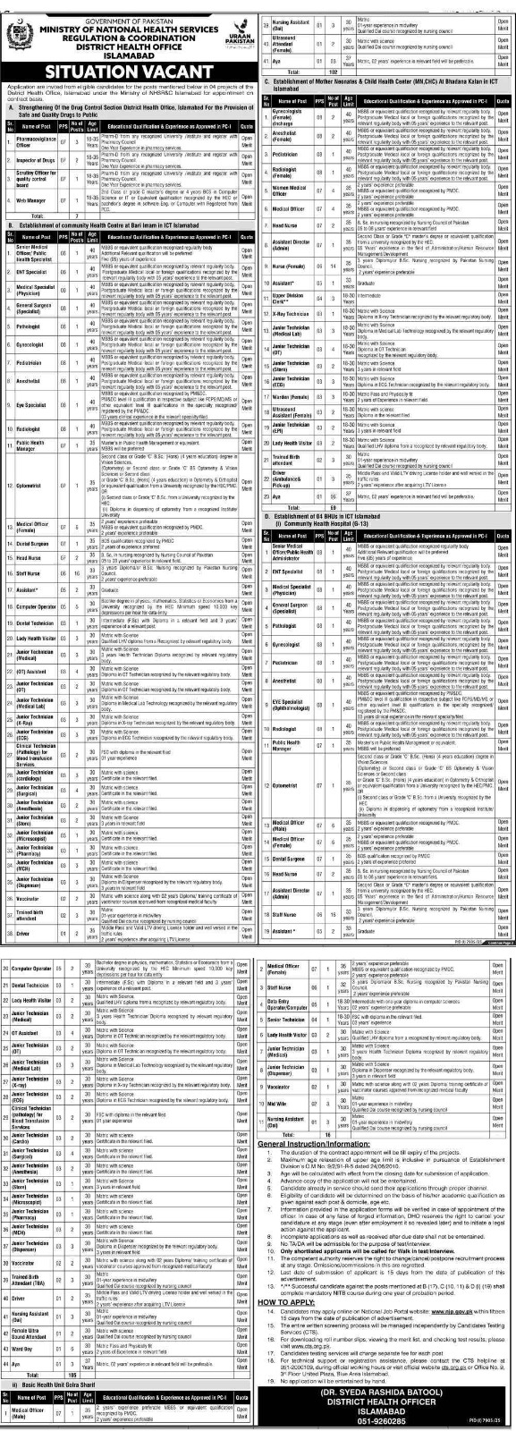 The following positions are open for recruitment across different departments including the Drug Control Section, Community Health Centers (Bari Imam & G-13), and Mother Neonatal & Child Health Centers: