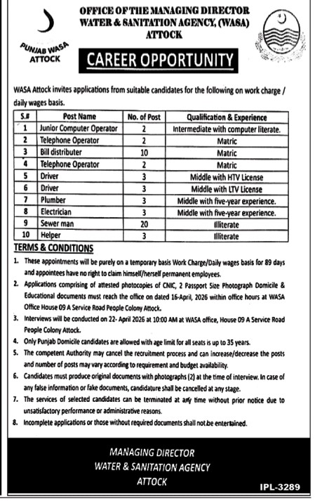 Selection Process: Interviews will be held on April 22, 2026, at 10:00 AM at the WASA Office in Attock.