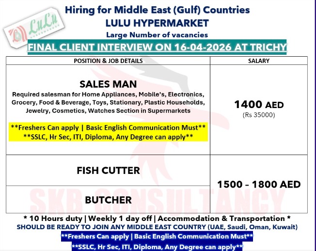 HomeJOBSHIRING FOR MIDDLE EAST (GULF) COUNTRIES LULU HYPERMARKETLAST DATE 16-04-2026 JOBS HIRING FOR MIDDLE EAST (GULF) COUNTRIES LULU HYPERMARKETLAST DATE 16-04-2026 By admin April 9, 2026 0 6 Share FacebookXPinterestWhatsApp HIRING FOR MIDDLE EAST (GULF) COUNTRIES LULU HYPERMARKET LAST DATE 16-04-2026 HIRING FOR MIDDLE EAST (GULF) COUNTRIESLULU HYPERMARKETLAST DATE 16-04-2026 Share FacebookXPinterestWhatsApp Previous articleAdvertisement of National Agri Trade and Food Safety Authority Islamabad Jobs 2026 Apply Online NAFSA PSWNext articleMale/Female Receptionist in dubai or Real state agent adminhttps://deltaexecutore.com RELATED ARTICLES JOBS Operator packaging – Night shift April 10, 2026 Uncategorized Machine operator dvs April 10, 2026 JOBS Warehouse operator April 10, 2026 LEAVE A REPLY Cancel reply Comment: Please enter your comment! Name:* Please enter your name here Email:* You have entered an incorrect email address! Please enter your email address here Website: Save my name, email, and website in this browser for the next time I comment. Most Popular Operator packaging – Night shift April 10, 2026 Machine operator dvs April 10, 2026 Warehouse operator April 10, 2026 DSV – Global transport and logistics April 10, 2026 Load more Recent Comments